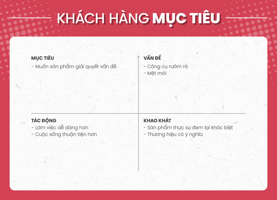- Vấn đề: Những vấn đề mà khách hàng của bạn đang gặp phải trước khi sử dụng sản phẩm? Điểm đau (Pain Point) và thách thức ngăn cản họ đạt được mục tiêu là gì?