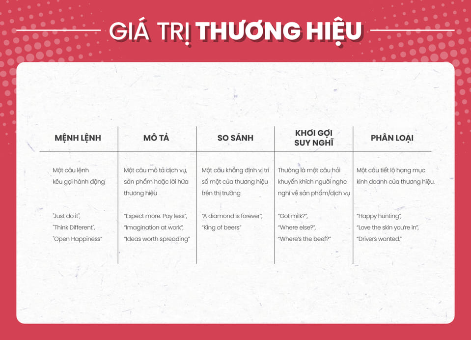 Loại 5: Phân loại: Một câu tiết lộ hạng mục kinh doanh của thương hiệu. Chẳng hạn như Ebay có “Happy hunting.”, Oley có “Love the skin you’re in.” và Volkwagen có “Drivers wanted.”