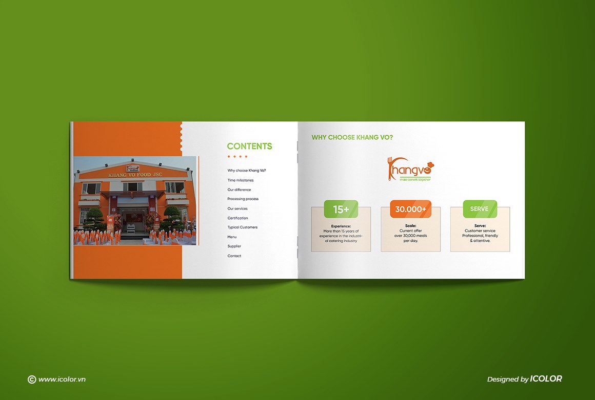 Khang Võ được thành lập vào tháng 03 năm 2009 với ngành nghề kinh doanh chính là cung cấp suất ăn theo hợp đồng. Hiện nay Khang Võ có trên 15 khách hàng và cung cấp hơn 20.000 suất ăn trên một ngày. Công ty phục vụ các mô hình: Cung cấp tại chổ (bếp ăn tập thể) và vận chuyển suất ăn tới nơi phục vụ (suất ăn công nghiệp).