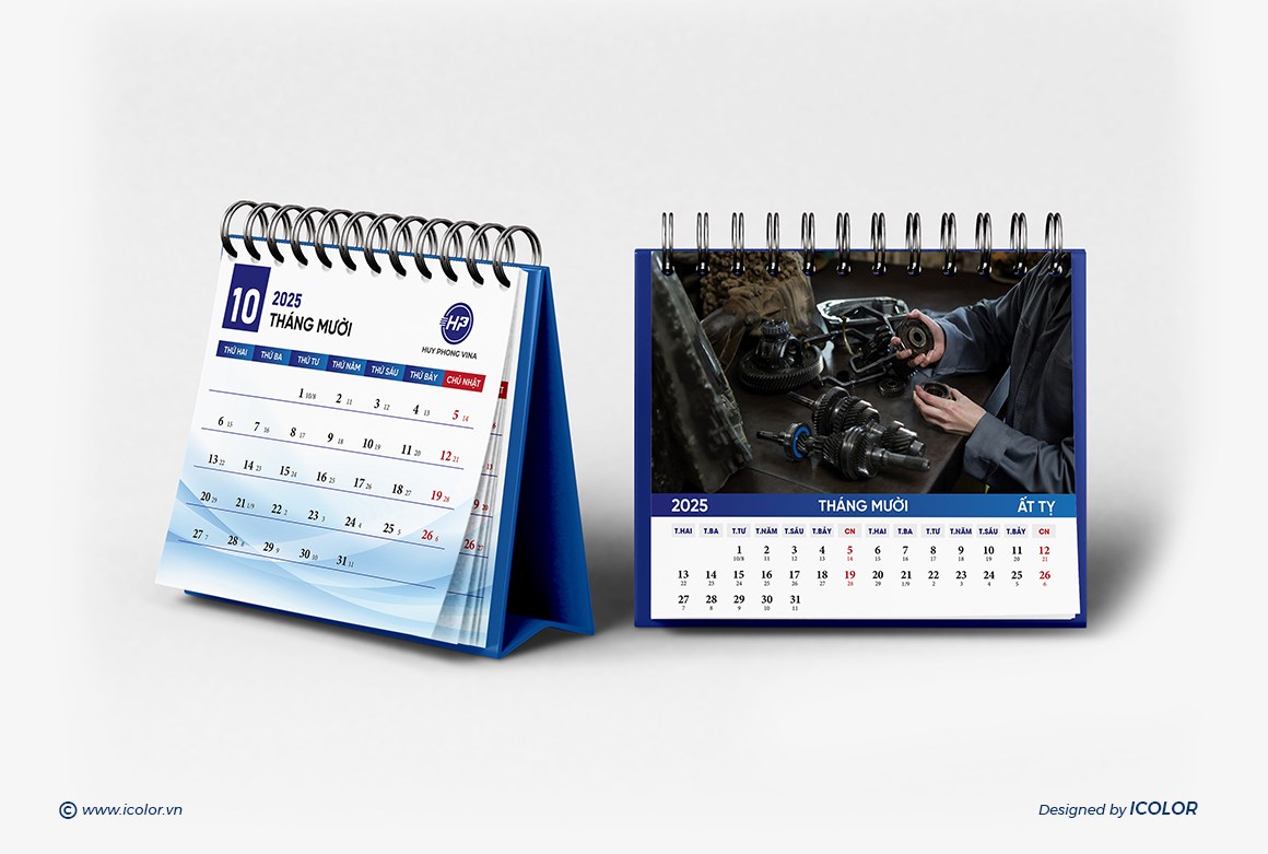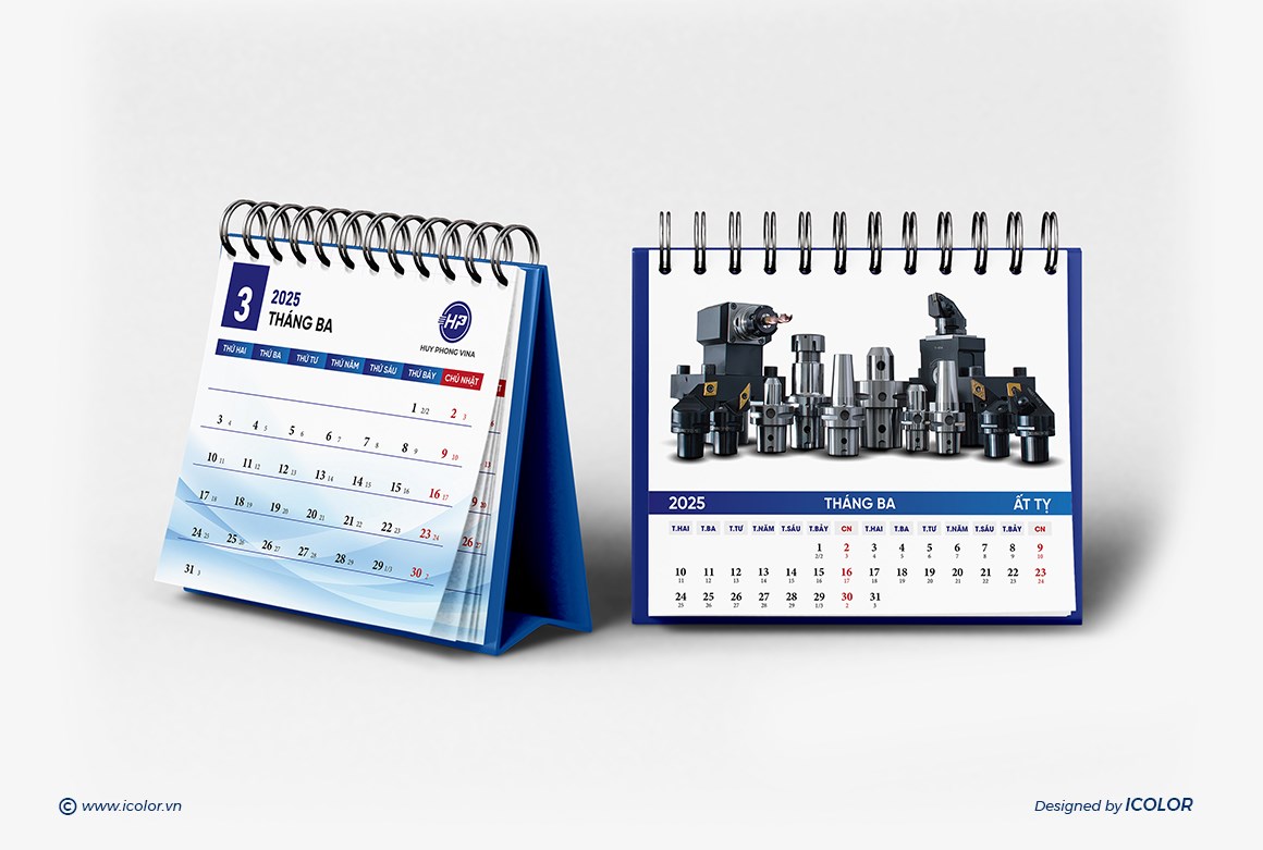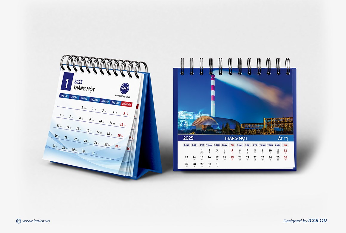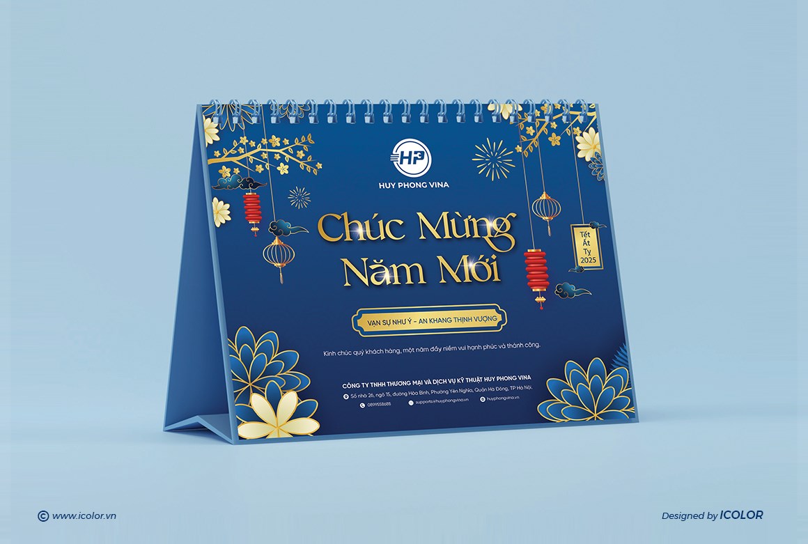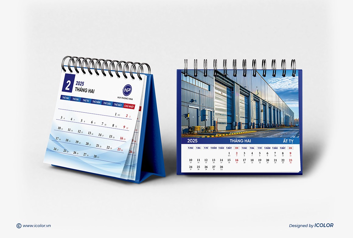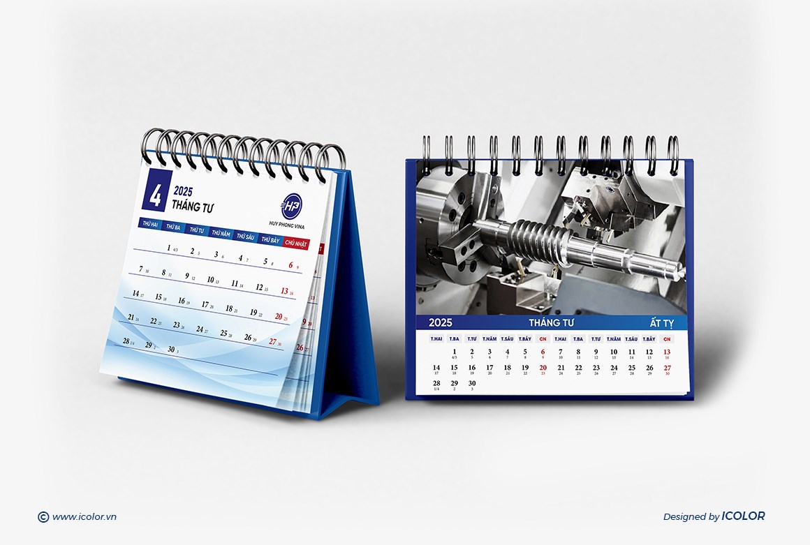 Lịch để bàn được thiết kế độc quyền cho Công ty Huy Phong Vina với phong cách hiện đại, tinh tế, mang đậm dấu ấn thương hiệu từ màu sắc đến hình ảnh chủ đạo. Mỗi trang lịch không chỉ hiển thị ngày tháng mà còn truyền tải thông điệp và giá trị cốt lõi của doanh nghiệp, thể hiện sự chuyên nghiệp và sáng tạo trong từng chi tiết. Sản phẩm được xem như một công cụ truyền thông thương hiệu hiệu quả, vừa có tính thẩm mỹ cao vừa mang tính ứng dụng thực tiễn. Toàn bộ quá trình lên ý tưởng và triển khai thiết kế đều được thực hiện chỉn chu, bám sát định hướng của Huy Phong Vina. Hình ảnh sử dụng trong lịch được chọn lọc kỹ lưỡng, phản ánh các hoạt động nổi bật của công ty. Không chỉ là vật phẩm sử dụng nội bộ, lịch còn được xem là món quà tri ân đầy ý nghĩa dành cho đối tác và khách hàng. Thiết kế này góp phần nâng cao giá trị thương hiệu và tạo dấu ấn sâu sắc trong lòng người nhận, thể hiện việc ứng dụng hiệu quả thiết kế sáng tạo vào hoạt động xây dựng hình ảnh doanh nghiệp.
