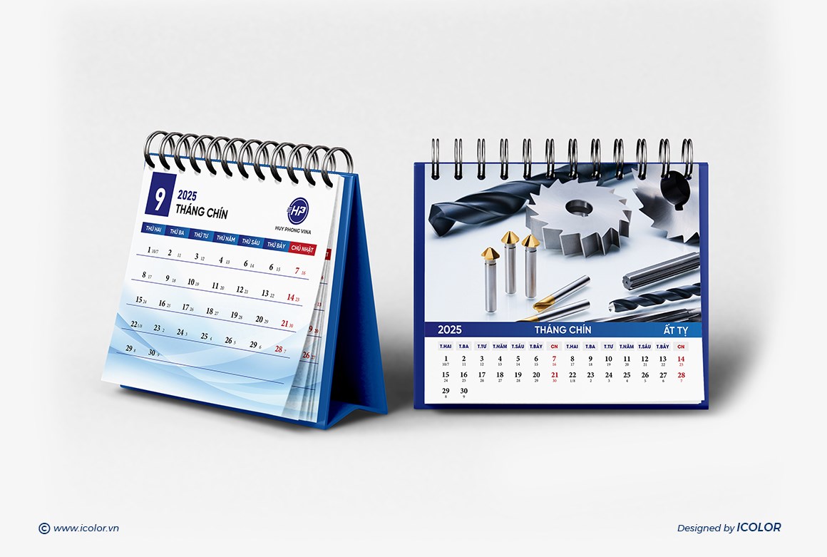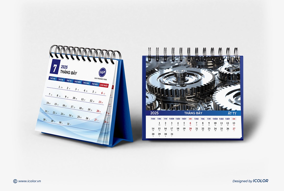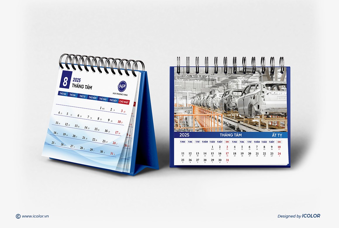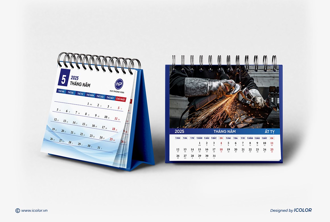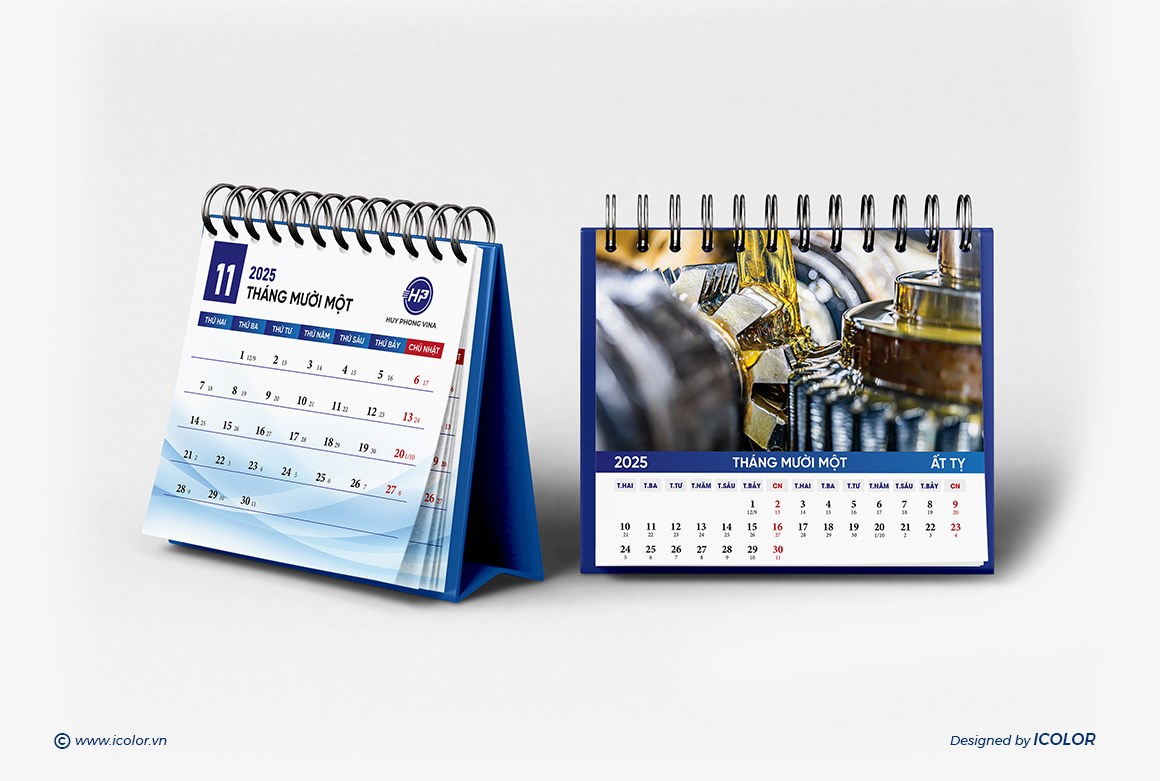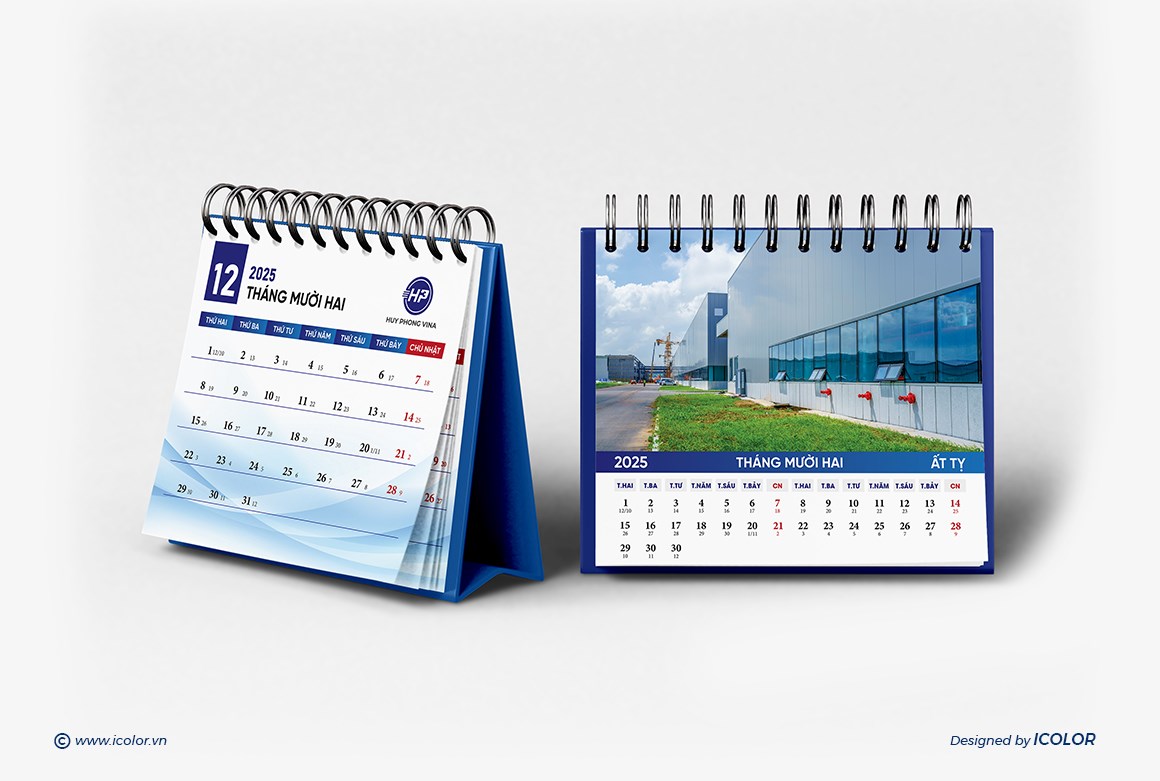 Lịch để bàn được thiết kế độc quyền cho Công ty Huy Phong Vina với phong cách hiện đại, tinh tế, mang đậm dấu ấn thương hiệu từ màu sắc đến hình ảnh chủ đạo. Mỗi trang lịch không chỉ hiển thị ngày tháng mà còn truyền tải thông điệp và giá trị cốt lõi của doanh nghiệp, thể hiện sự chuyên nghiệp và sáng tạo trong từng chi tiết. Sản phẩm được xem như một công cụ truyền thông thương hiệu hiệu quả, vừa có tính thẩm mỹ cao vừa mang tính ứng dụng thực tiễn. Toàn bộ quá trình lên ý tưởng và triển khai thiết kế đều được thực hiện chỉn chu, bám sát định hướng của Huy Phong Vina. Hình ảnh sử dụng trong lịch được chọn lọc kỹ lưỡng, phản ánh các hoạt động nổi bật của công ty. Không chỉ là vật phẩm sử dụng nội bộ, lịch còn được xem là món quà tri ân đầy ý nghĩa dành cho đối tác và khách hàng. Thiết kế này góp phần nâng cao giá trị thương hiệu và tạo dấu ấn sâu sắc trong lòng người nhận, thể hiện việc ứng dụng hiệu quả thiết kế sáng tạo vào hoạt động xây dựng hình ảnh doanh nghiệp.