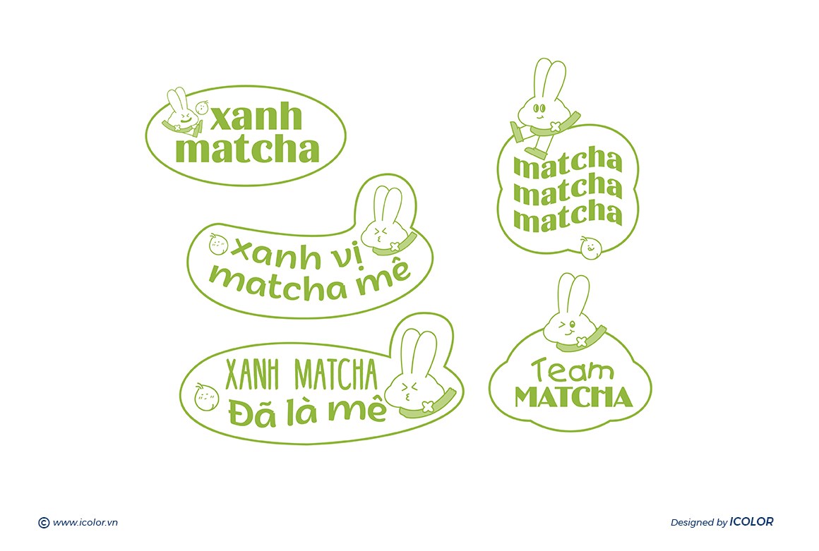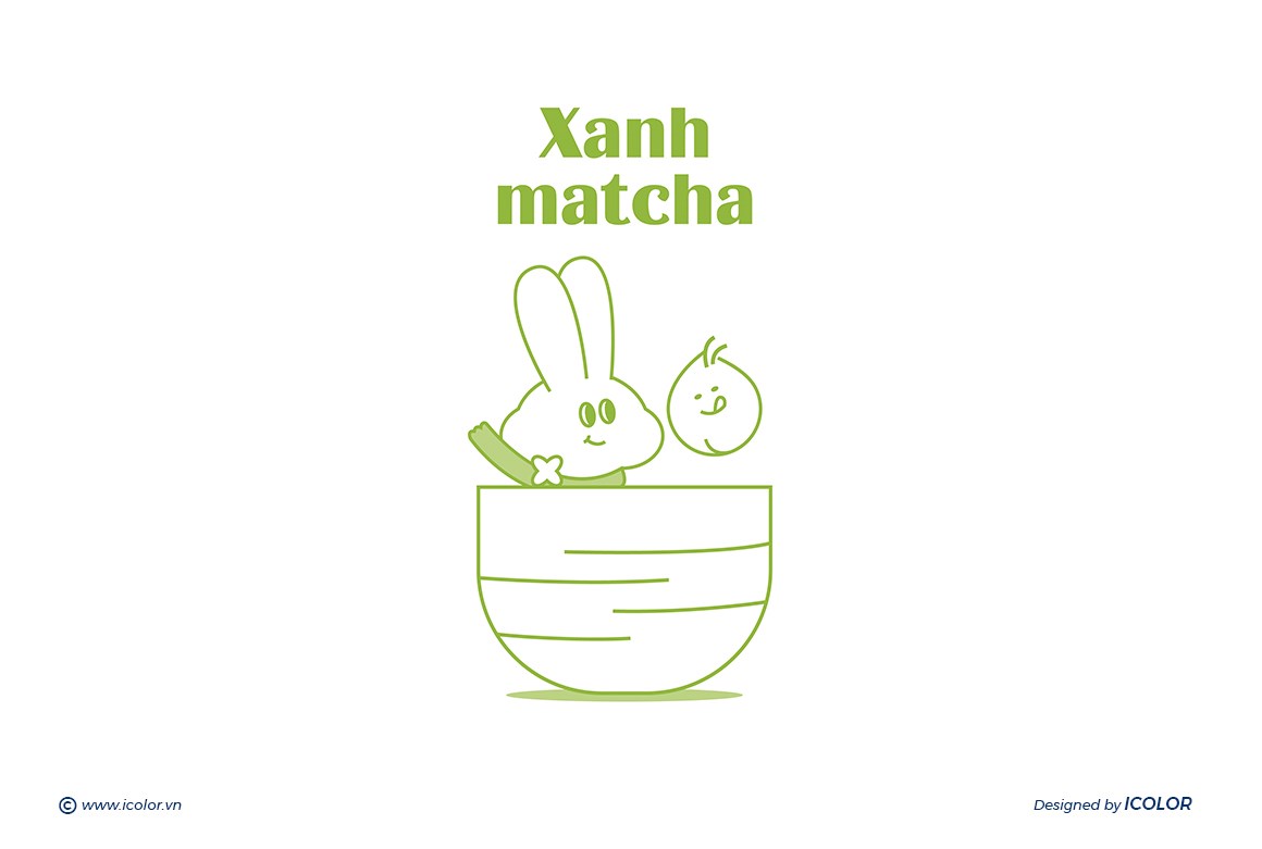 Xanh Matcha với logo hình tròn màu xanh lá, kết hợp hình ảnh chiếc lá và chú thỏ nhỏ tinh nghịch, vừa truyền tải sự tươi mát, tự nhiên của matcha, vừa tạo cảm giác thân thiện, dễ gần với khách hàng.