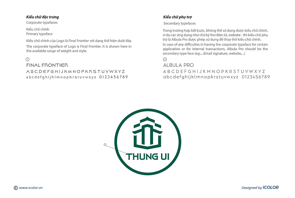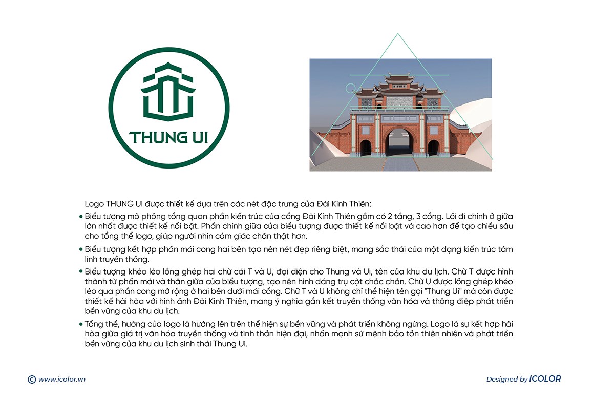 Phần chữ “THUNG UI” được thiết kế cứng cáp nhưng vẫn giữ được nét mềm mại, tạo cảm giác vừa thân thuộc, vừa hiện đại. Màu xanh lá chủ đạo thể hiện sự tươi mới, gắn bó với thiên nhiên, cam kết của Thung UI trong việc gìn giữ và bảo tồn vẻ đẹp nguyên sơ, mang đến trải nghiệm xanh – sạch – đẹp cho du khách.