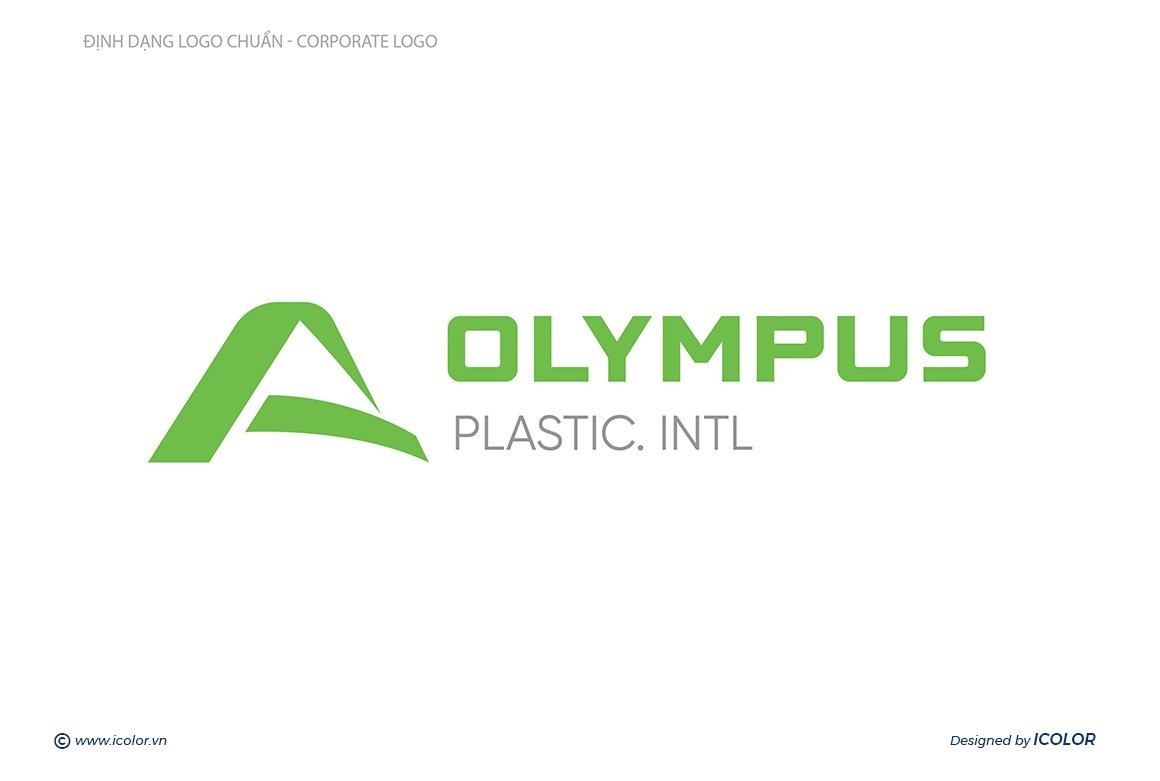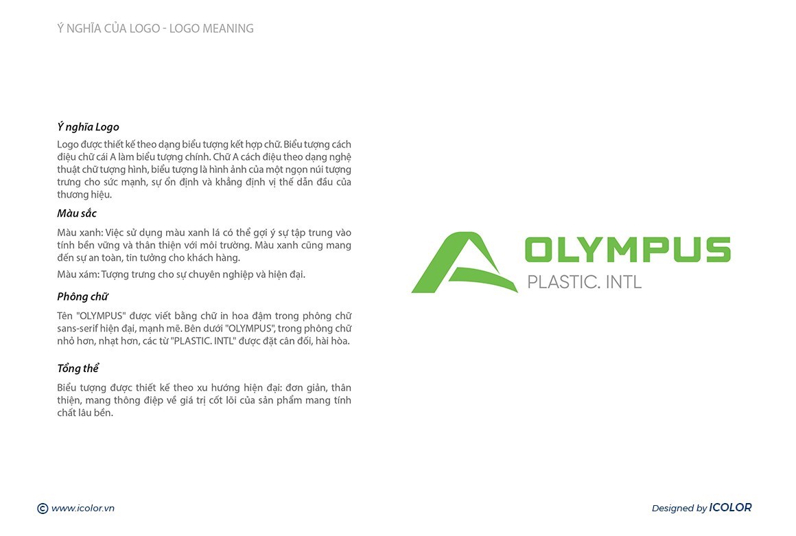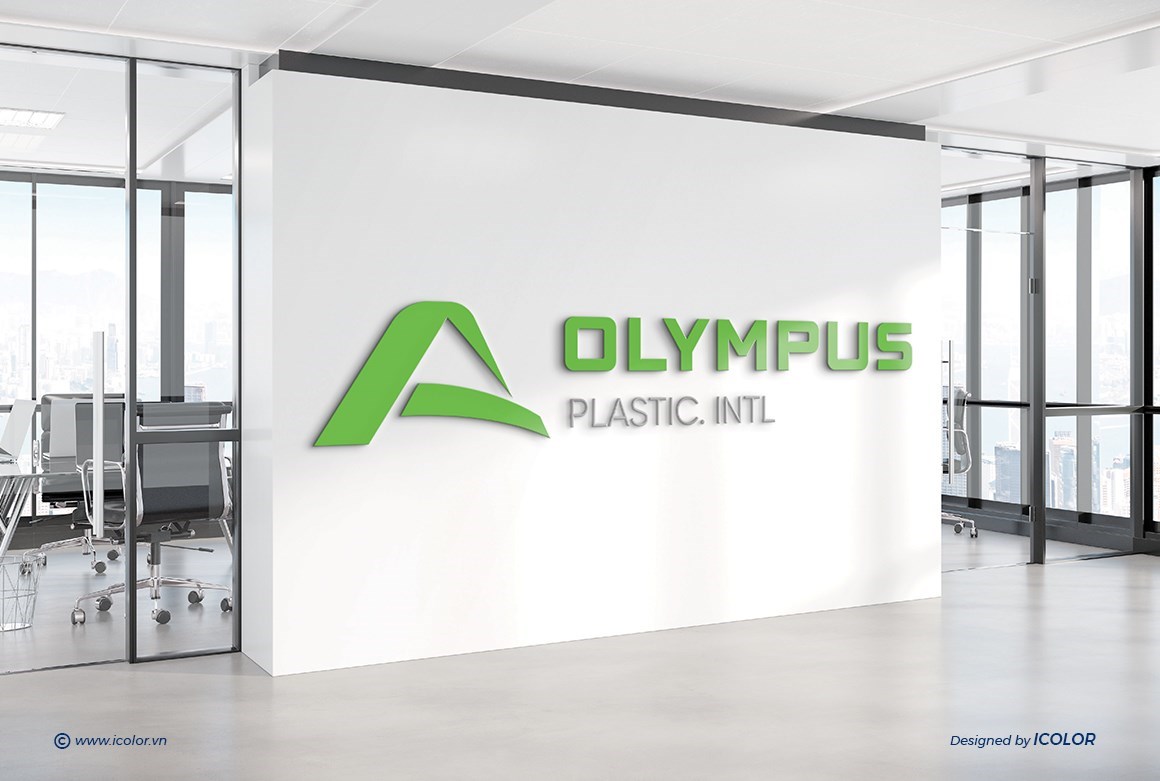- Biểu tượng màu xanh lá có hình dáng cách điệu, gợi lên hình ảnh ngọn núi Olympus – biểu tượng của sự vững chắc, vươn cao và chinh phục. Màu xanh cũng đại diện cho sự thân thiện với môi trường, phù hợp với lĩnh vực nhựa và định hướng phát triển bền vững.