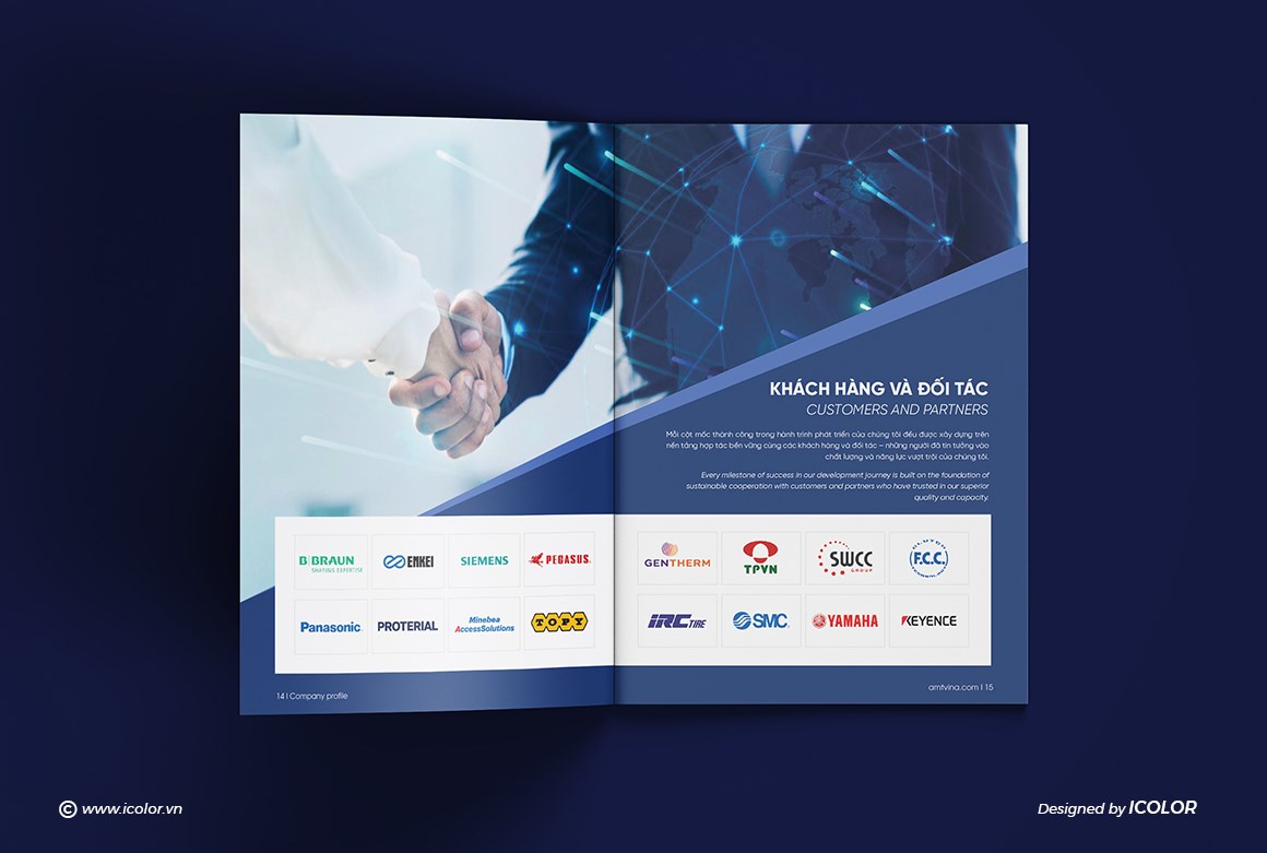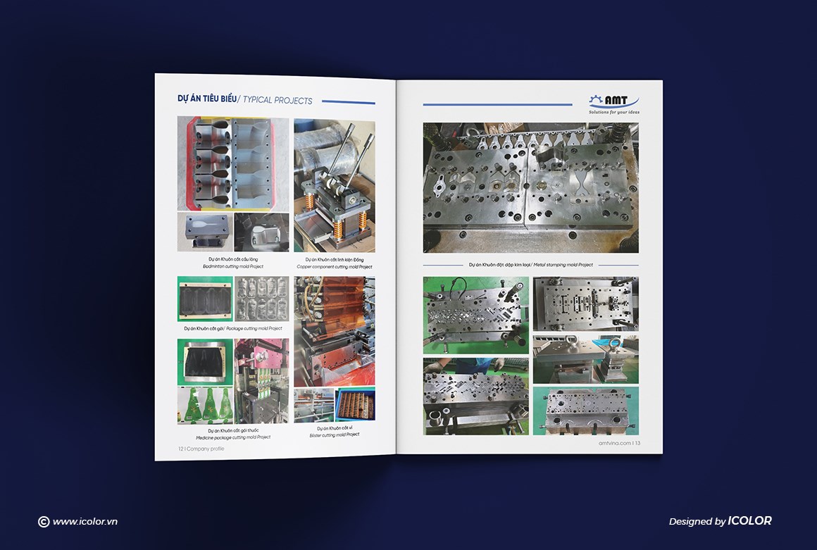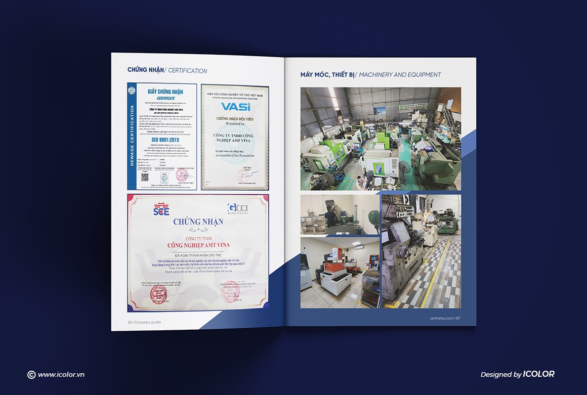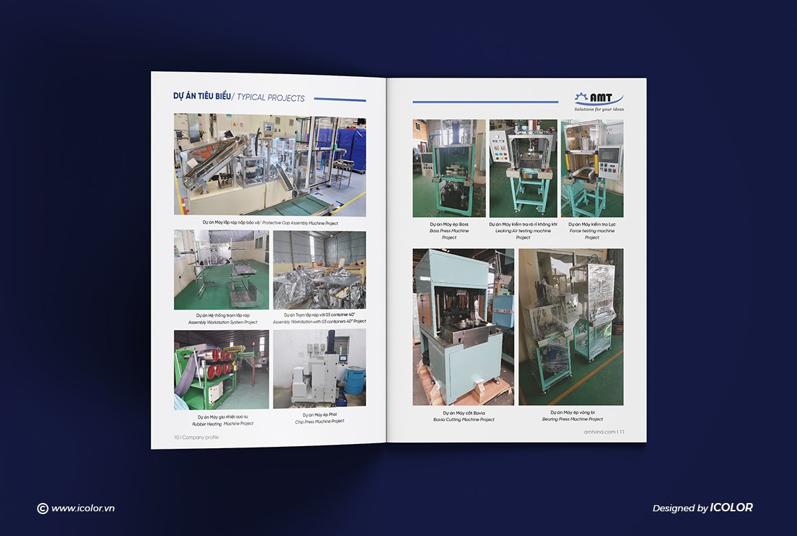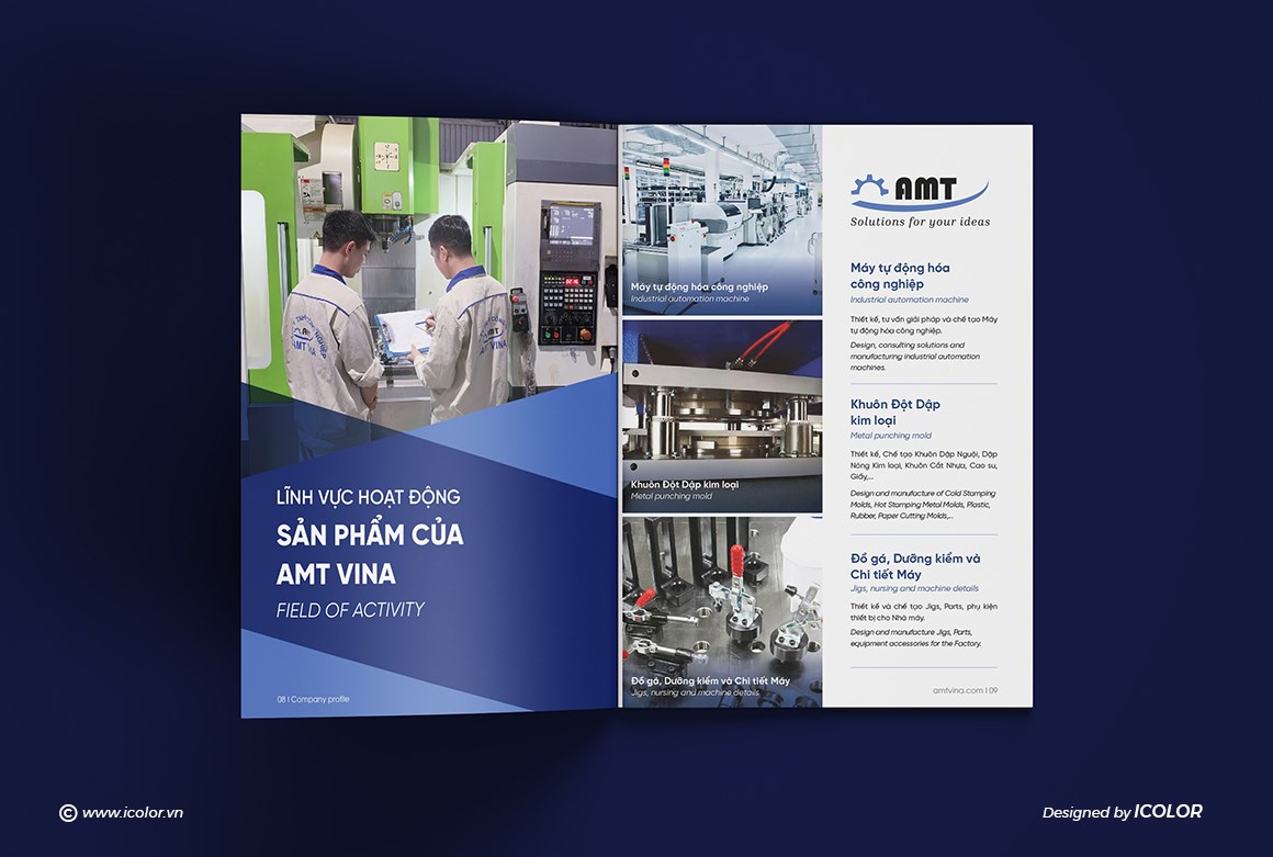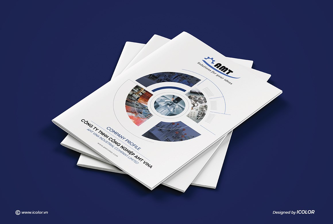 Profile của Công ty TNHH Công Nghiệp AMT Vina được iColor thiết kế theo phong cách hiện đại – chuyên nghiệp. Bìa profile sử dụng tông trắng – xanh dương chủ đạo, kết hợp hình ảnh sản xuất và công nghệ, thể hiện rõ năng lực và định hướng của doanh nghiệp.