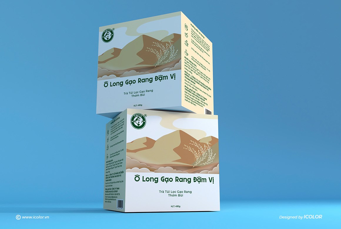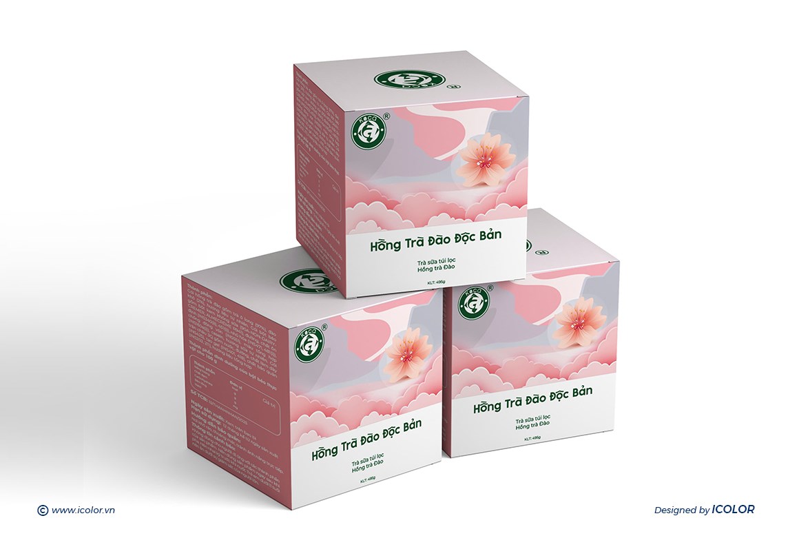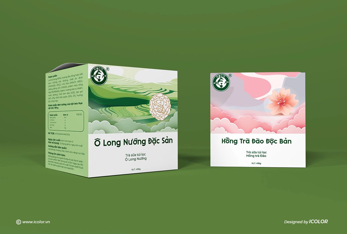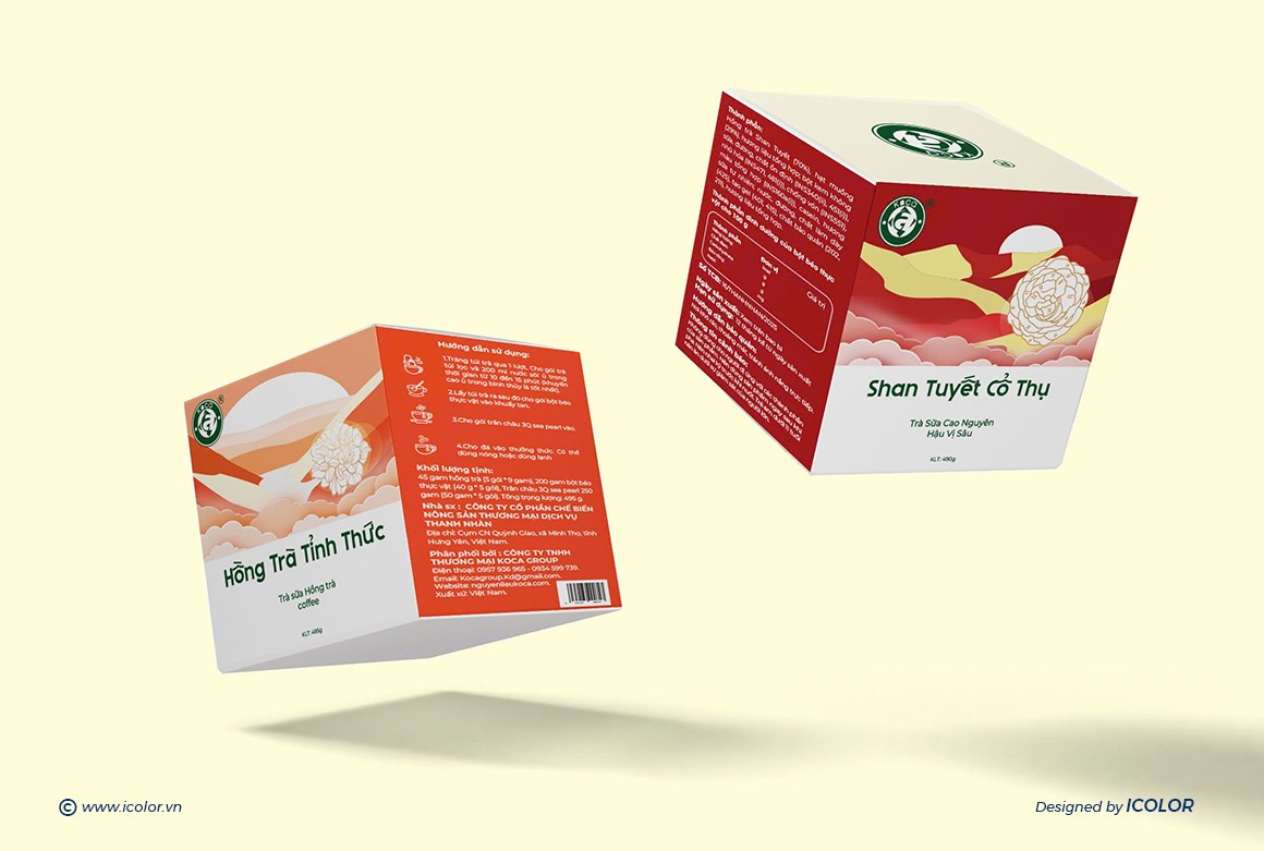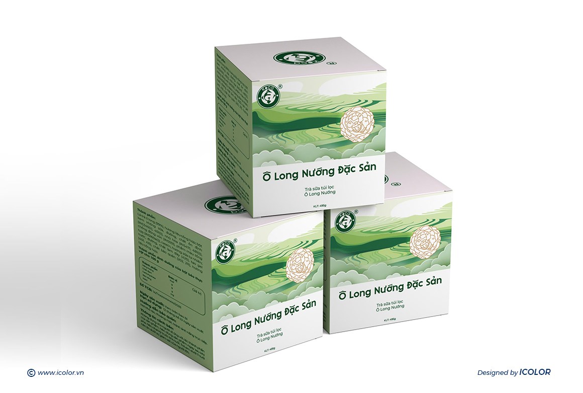Logo, biểu tượng hoa trà được nhấn mạnh, thông tin trình bày rõ ràng, hiện đại. Mỗi hộp trà không chỉ là sản phẩm mà còn kể câu chuyện về hương vị – vùng đất – tinh hoa trà Việt, khẳng định sự tinh tế và chuyên nghiệp của thương hiệu.