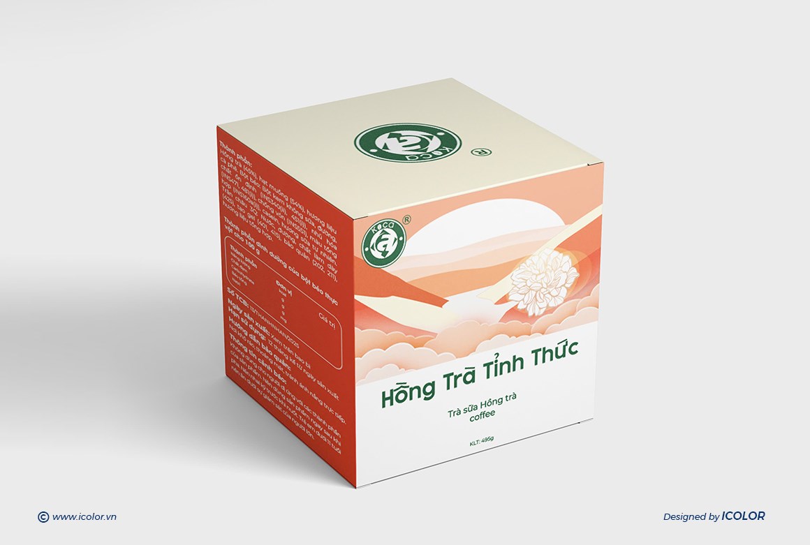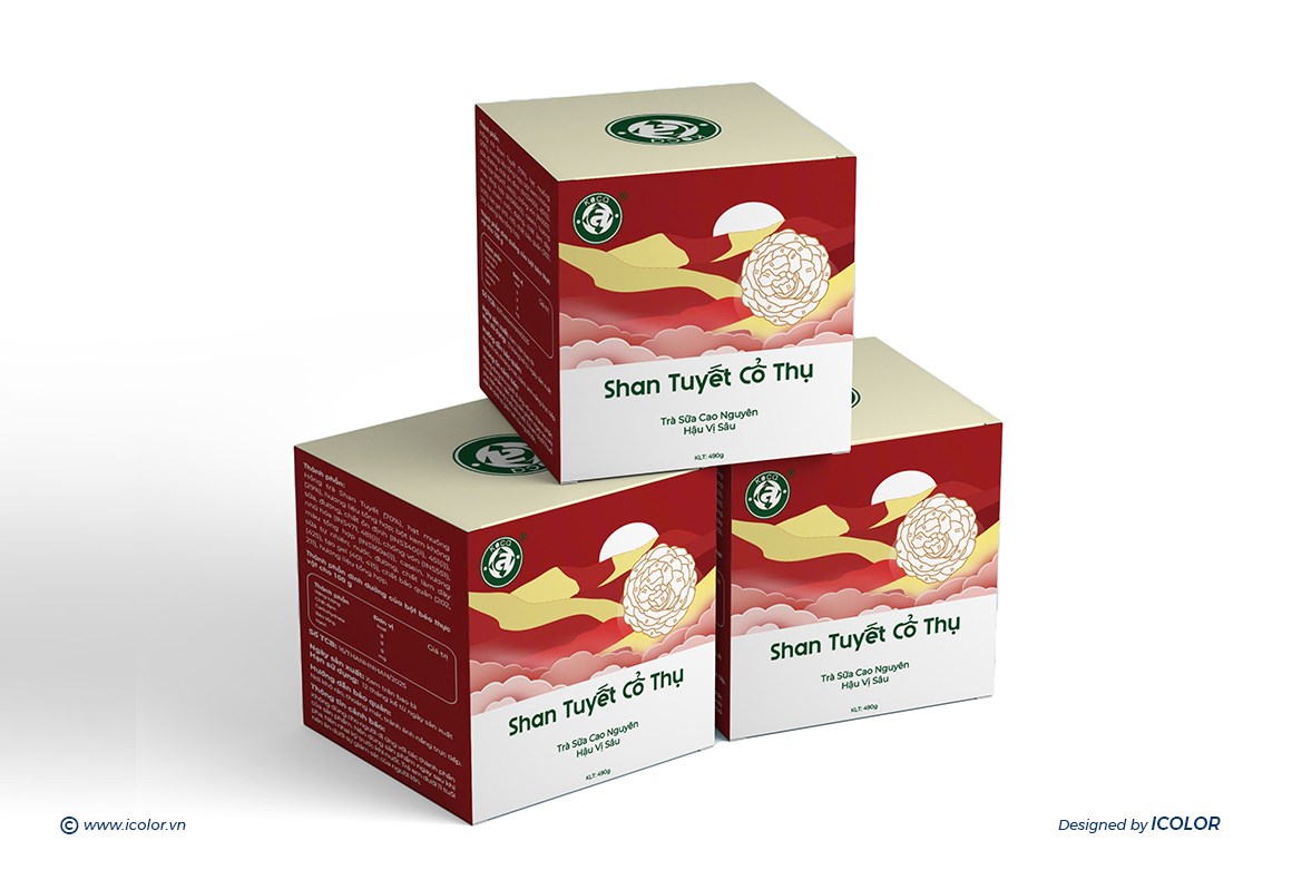 Thiết kế bao bì nổi bật với màu sắc riêng cho từng hương vị: xanh cho Ô Long, hồng cho Hồng Trà Đào, đỏ – vàng cho Shan Tuyết, cam cho Hồng Trà Tỉnh Thức. Hình ảnh mây trời, hoa lá mang hơi thở thiên nhiên, gợi sự tinh khiết và nguyên bản.
