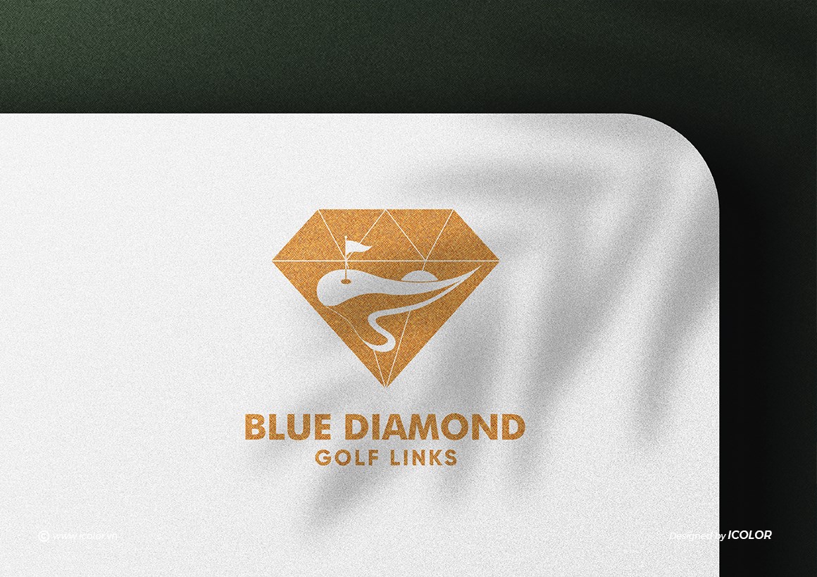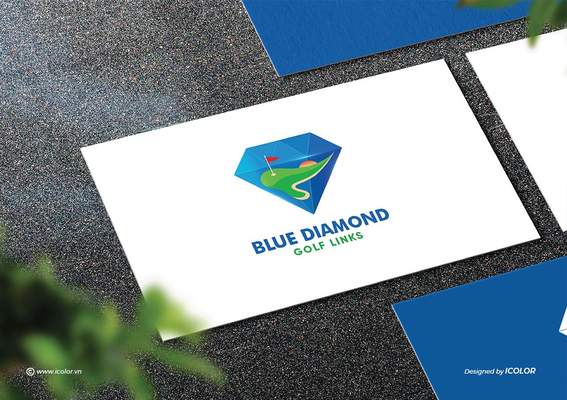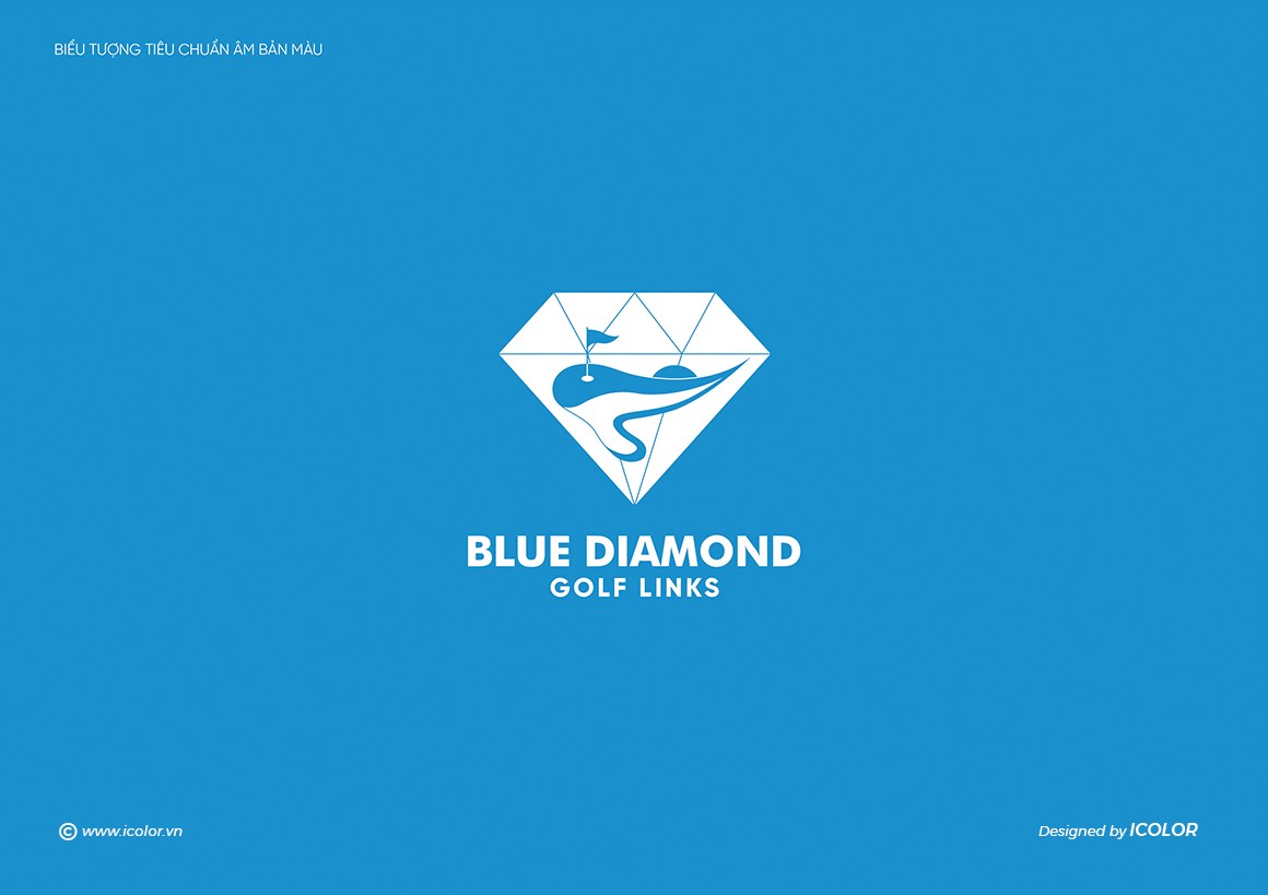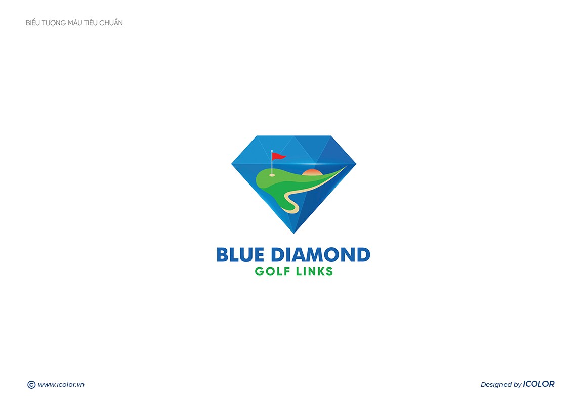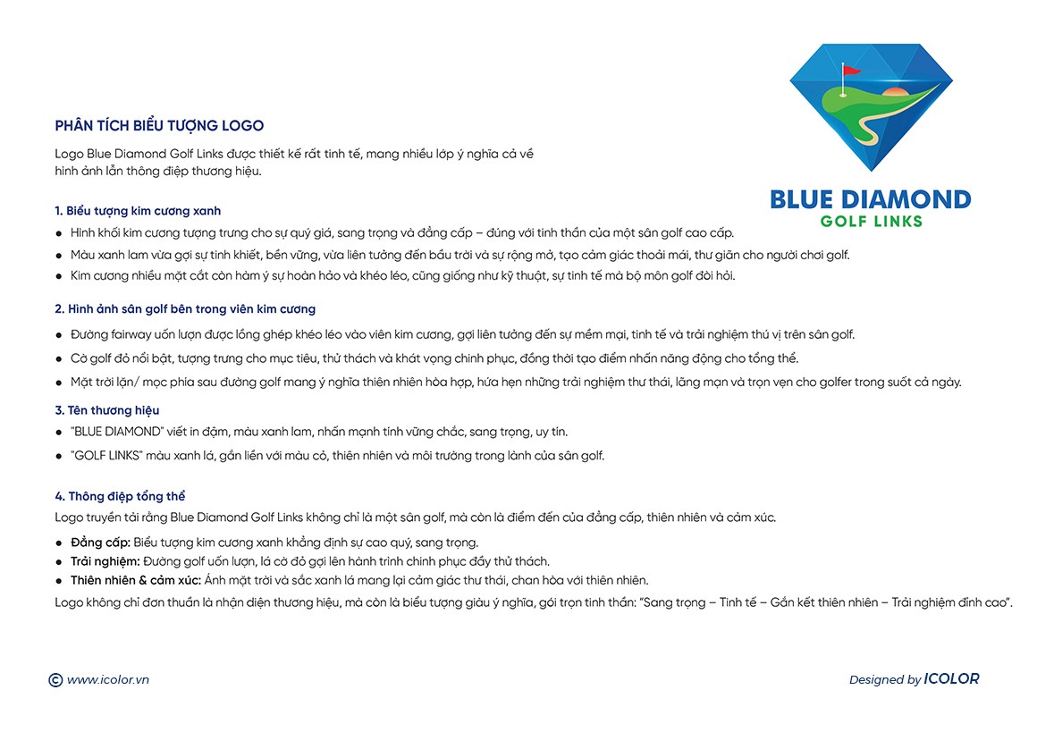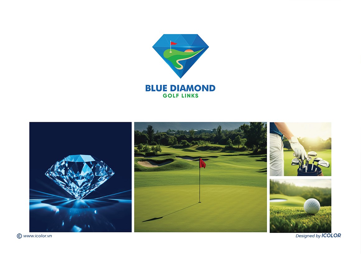 Biểu tượng viên kim cương xanh thể hiện đẳng cấp, sự tinh khiết và giá trị bền vững. Bên trong là hình ảnh đường golf uốn lượn hướng ra biển, tượng trưng cho vẻ đẹp thiên nhiên Quảng Bình và tinh thần thể thao thăng hoa. Màu xanh dương chủ đạo mang ý nghĩa về hòa bình, phát triển và tầm nhìn vươn xa của thương hiệu.