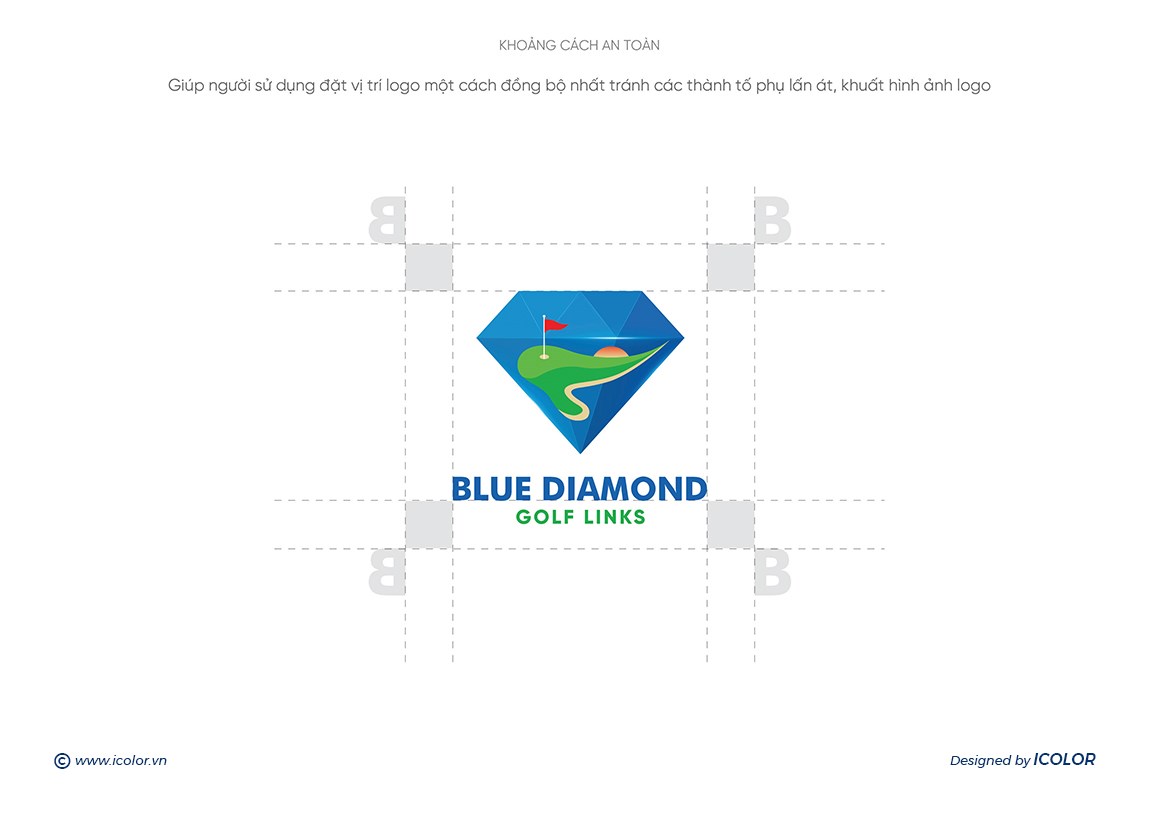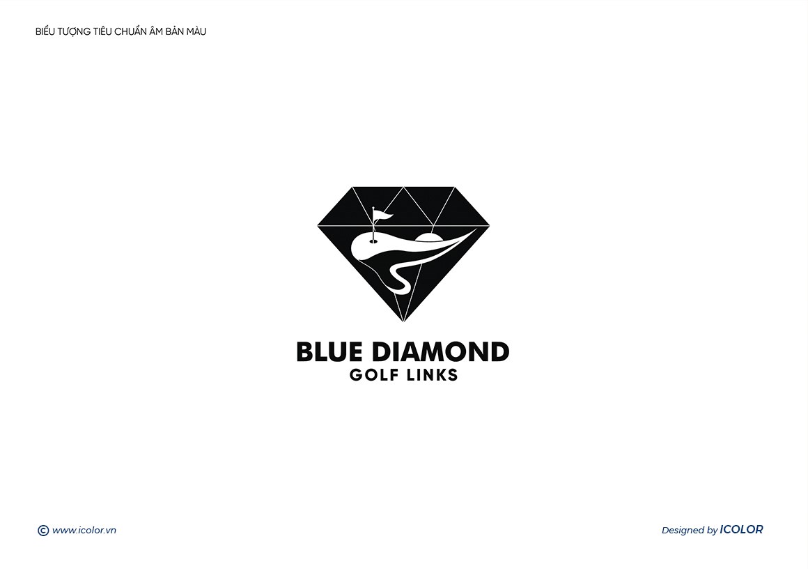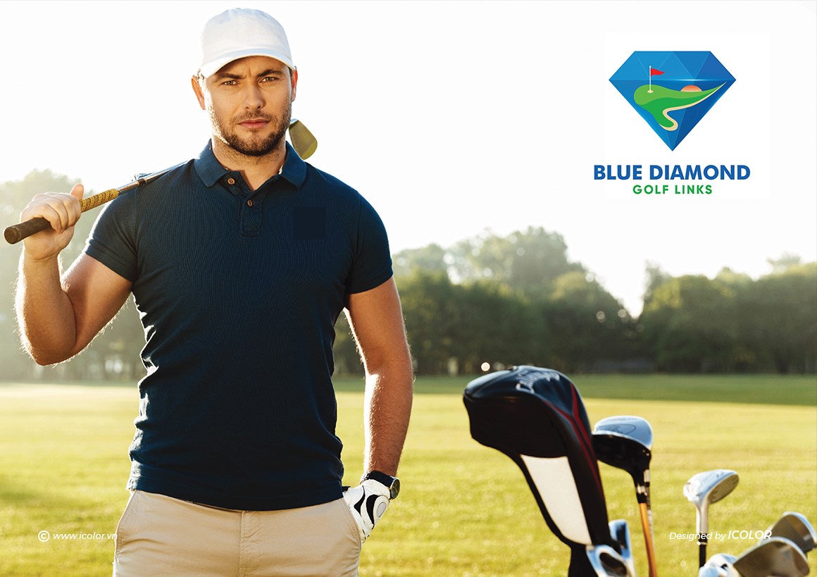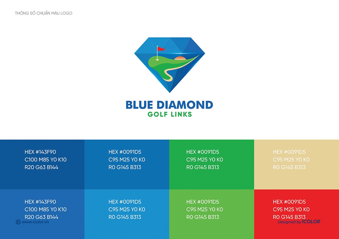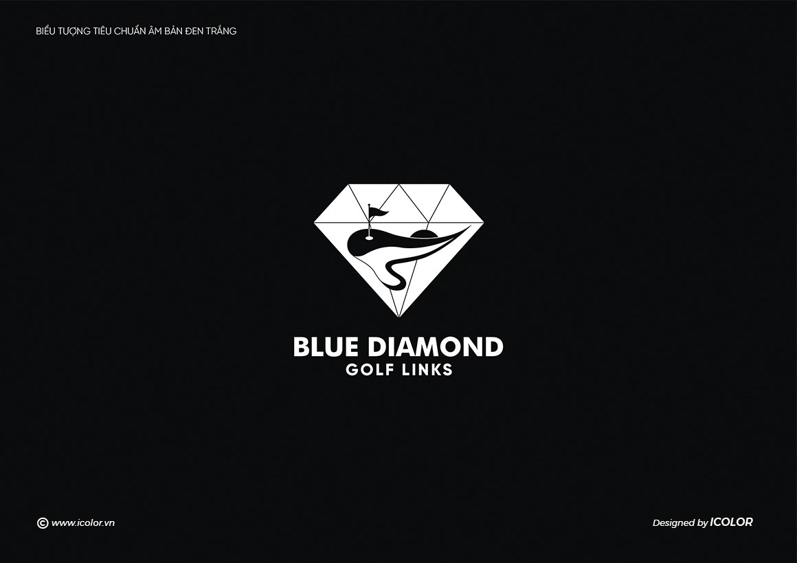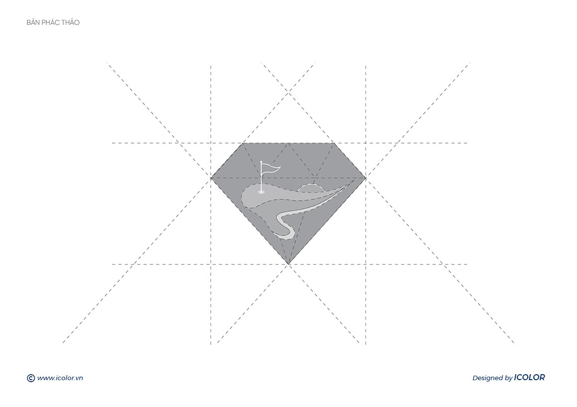 Biểu tượng viên kim cương xanh thể hiện đẳng cấp, sự tinh khiết và giá trị bền vững. Bên trong là hình ảnh đường golf uốn lượn hướng ra biển, tượng trưng cho vẻ đẹp thiên nhiên Quảng Bình và tinh thần thể thao thăng hoa. Màu xanh dương chủ đạo mang ý nghĩa về hòa bình, phát triển và tầm nhìn vươn xa của thương hiệu.