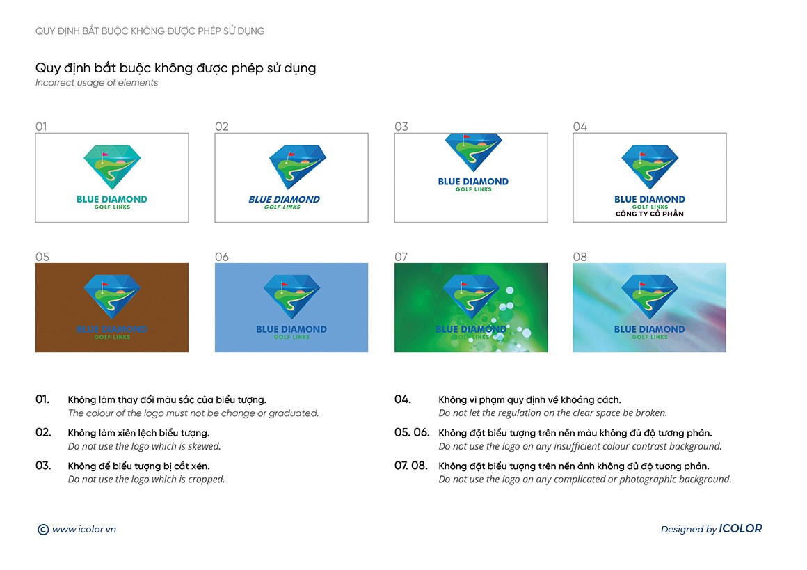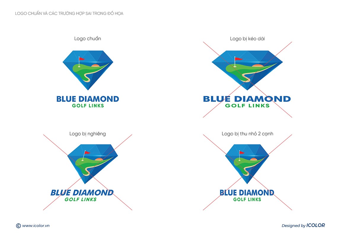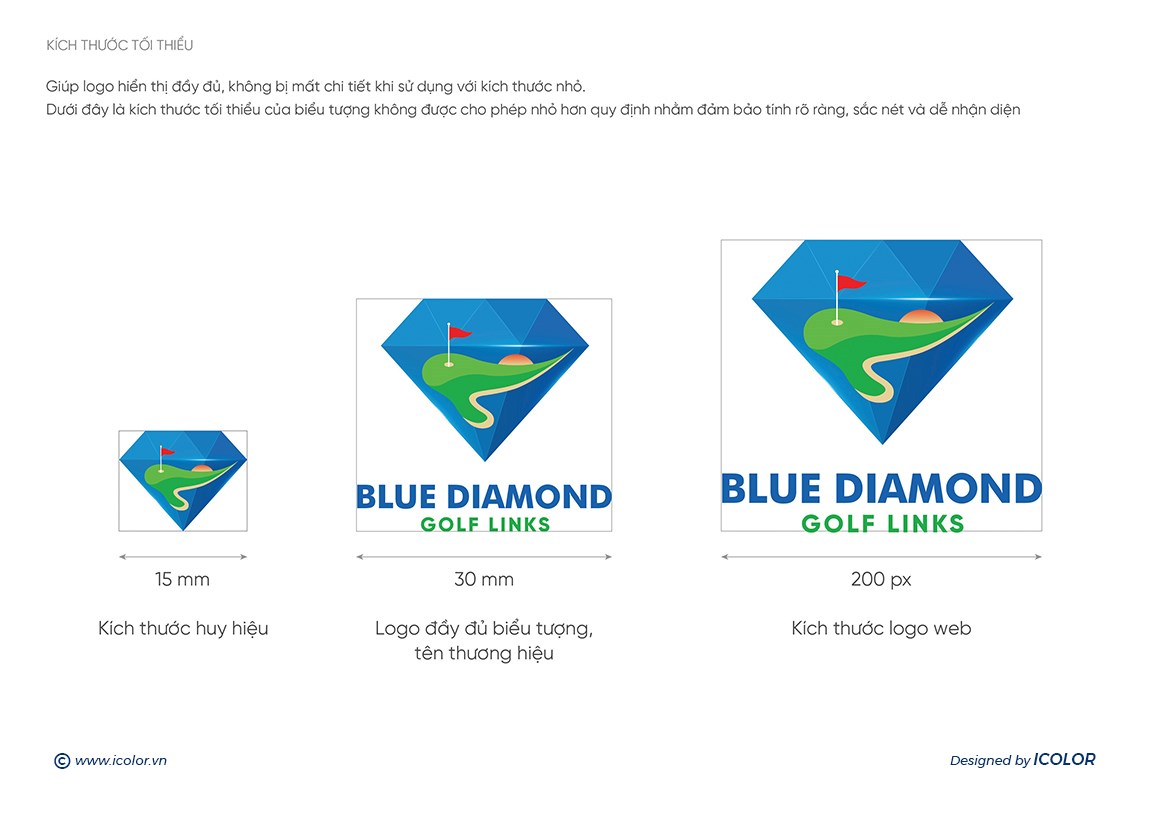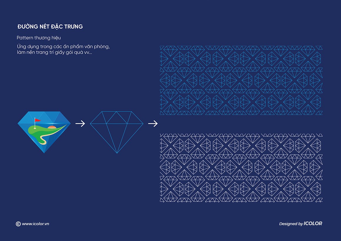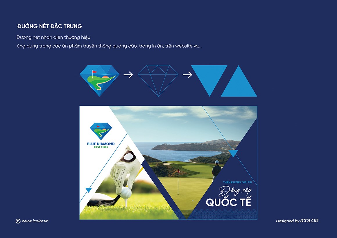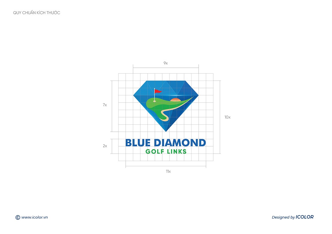 Biểu tượng viên kim cương xanh thể hiện đẳng cấp, sự tinh khiết và giá trị bền vững. Bên trong là hình ảnh đường golf uốn lượn hướng ra biển, tượng trưng cho vẻ đẹp thiên nhiên Quảng Bình và tinh thần thể thao thăng hoa. Màu xanh dương chủ đạo mang ý nghĩa về hòa bình, phát triển và tầm nhìn vươn xa của thương hiệu.