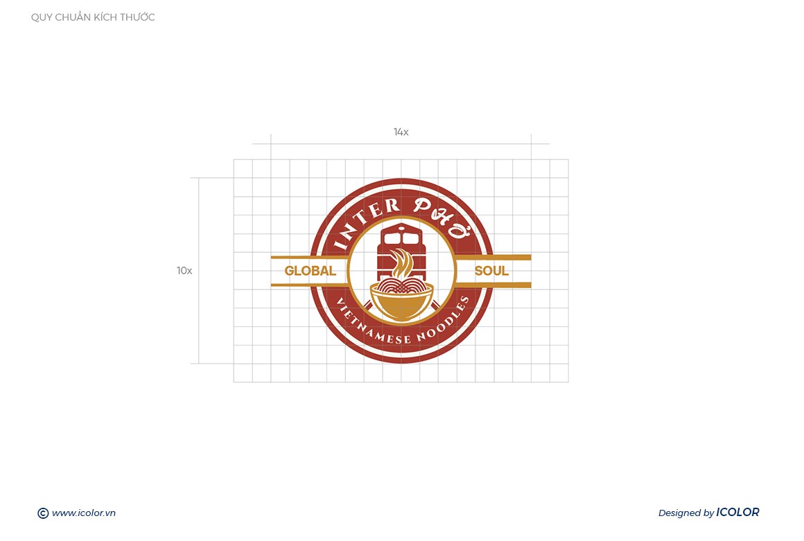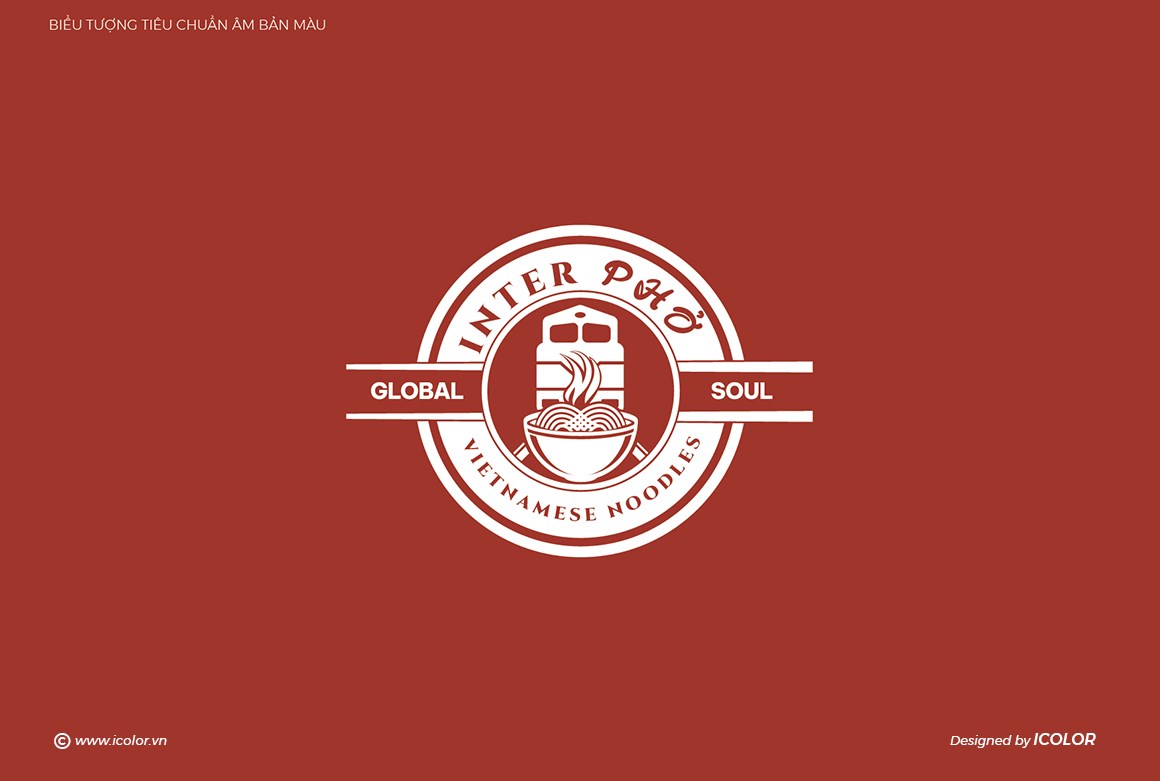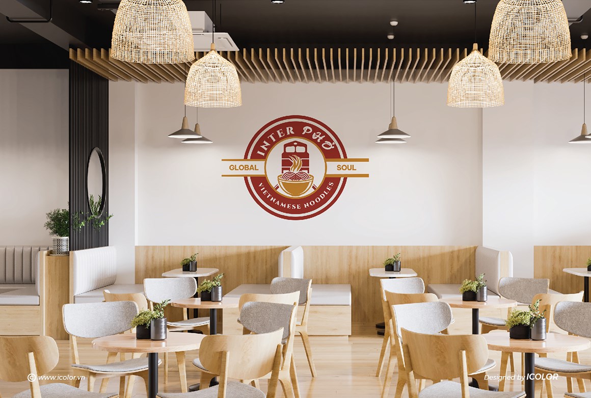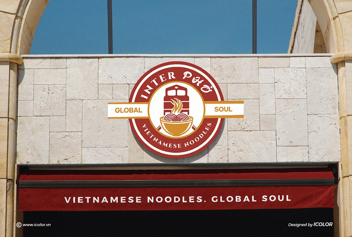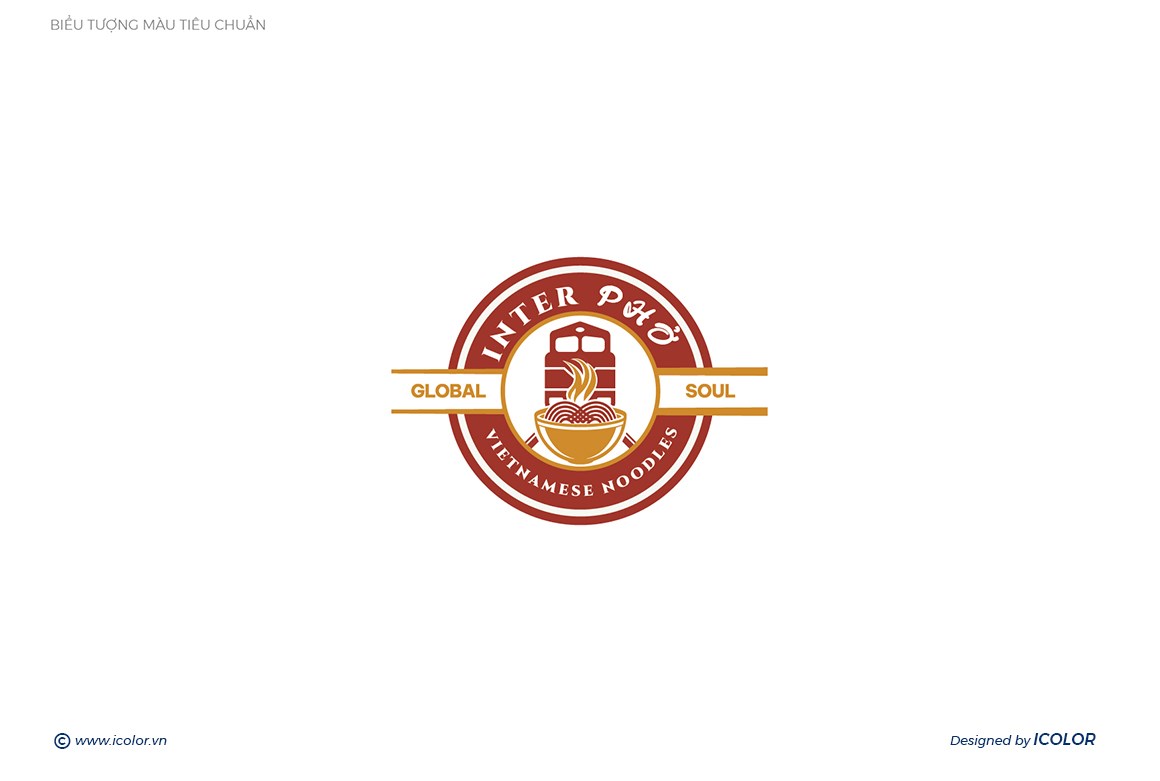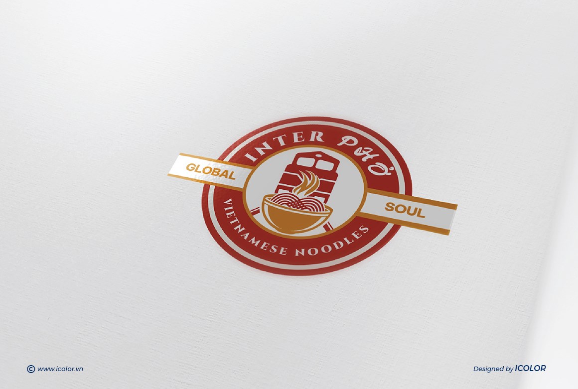 Logo Inter Phở có bố cục hình tròn, màu đỏ nâu và vàng làm chủ đạo, gợi cảm giác ấm áp, ngon miệng và sang trọng.