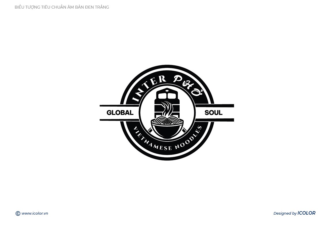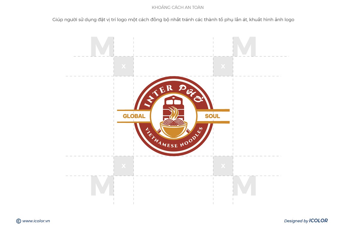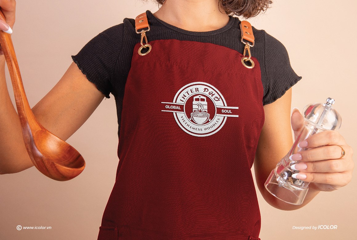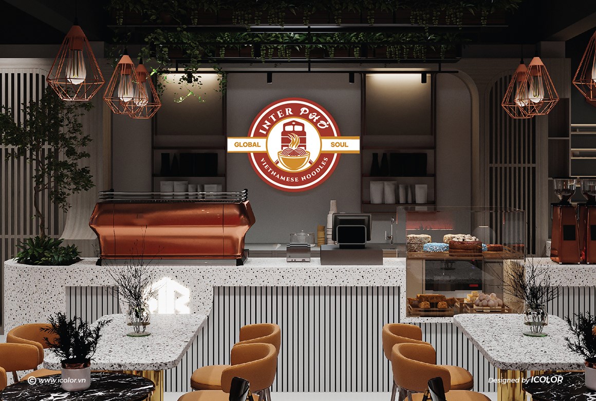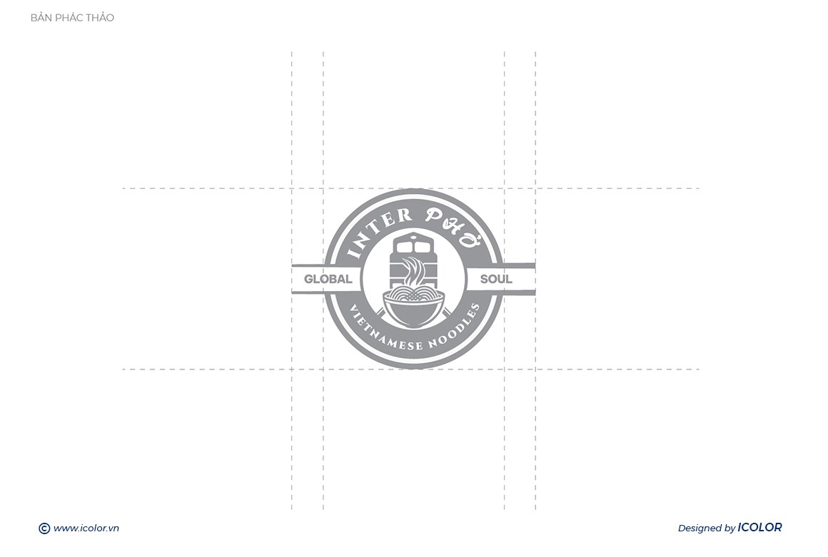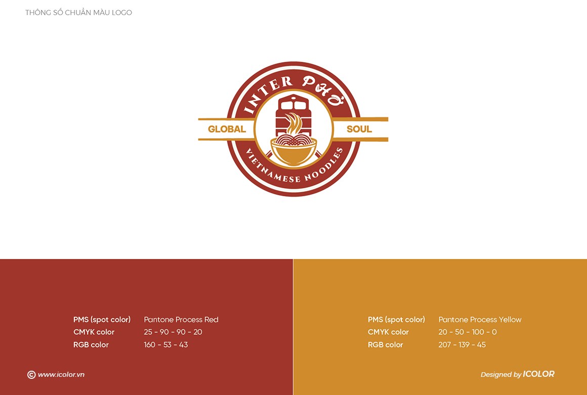 Logo Inter Phở có bố cục hình tròn, màu đỏ nâu và vàng làm chủ đạo, gợi cảm giác ấm áp, ngon miệng và sang trọng.